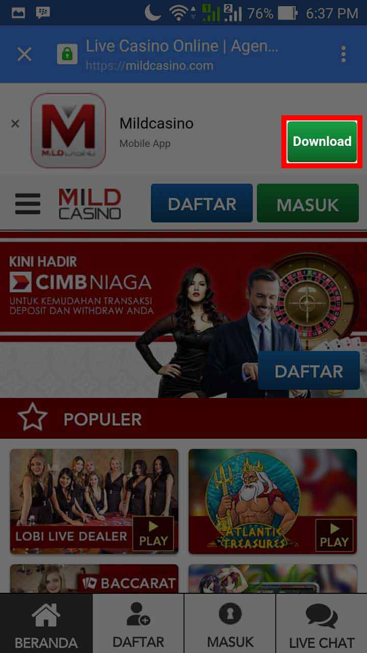Masuk ke menu Browser Mobile anda dan Kunjungi www.MildCasino.com setelah itu klik menu MOBILE lalu klik button Download Now, dan tunggu proses download selesai.