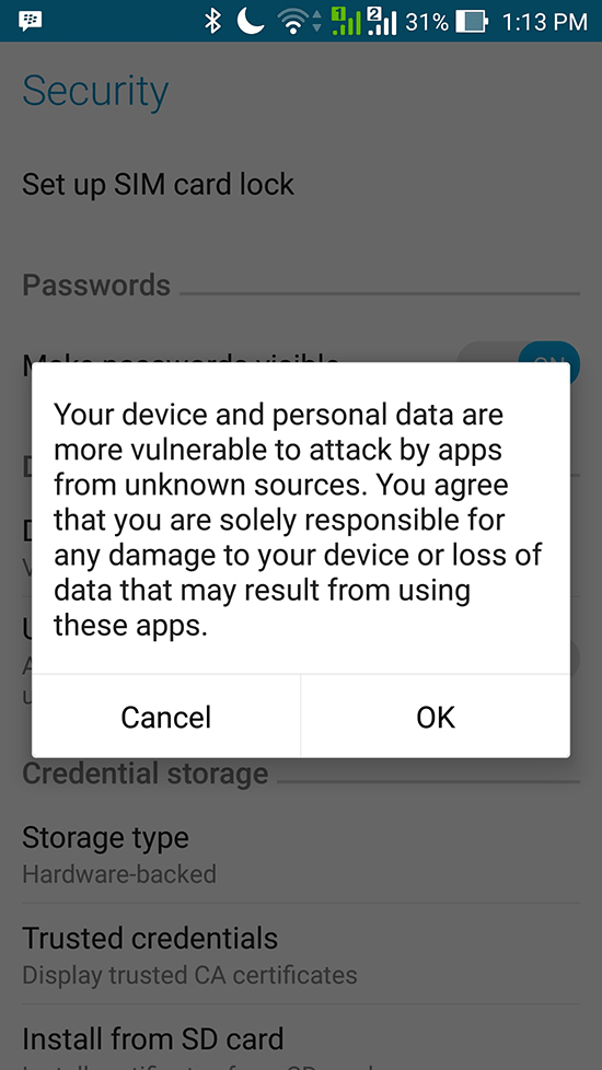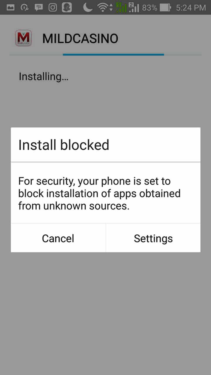 Jika sudah selesai, klik dan install langsung file MildCasino.apk, jika muncul keterangan Install Blocked, Pilih dan Klik “Settings”, setelah itu pilih “ Unknown Source” di bagian “ Security”, Centang/Klik pada bagian seperti yang dilingkari pada gambar dibawah ini.